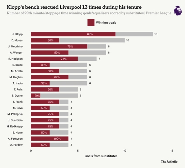 Người thực sự thống trị hạng mục này là Jurgen Klopp của Liverpool (với 13 bàn thắng quyết định từ ghế dự bị - số 1 lịch sử). Và tại Ngoại hạng Anh 2025/26, danh sách những HLV tận dụng thời gian bù giờ tốt nhất gọi tên ba chiến lược gia đương đại: Marco Silva, Thomas Frank và Mikel Arteta.