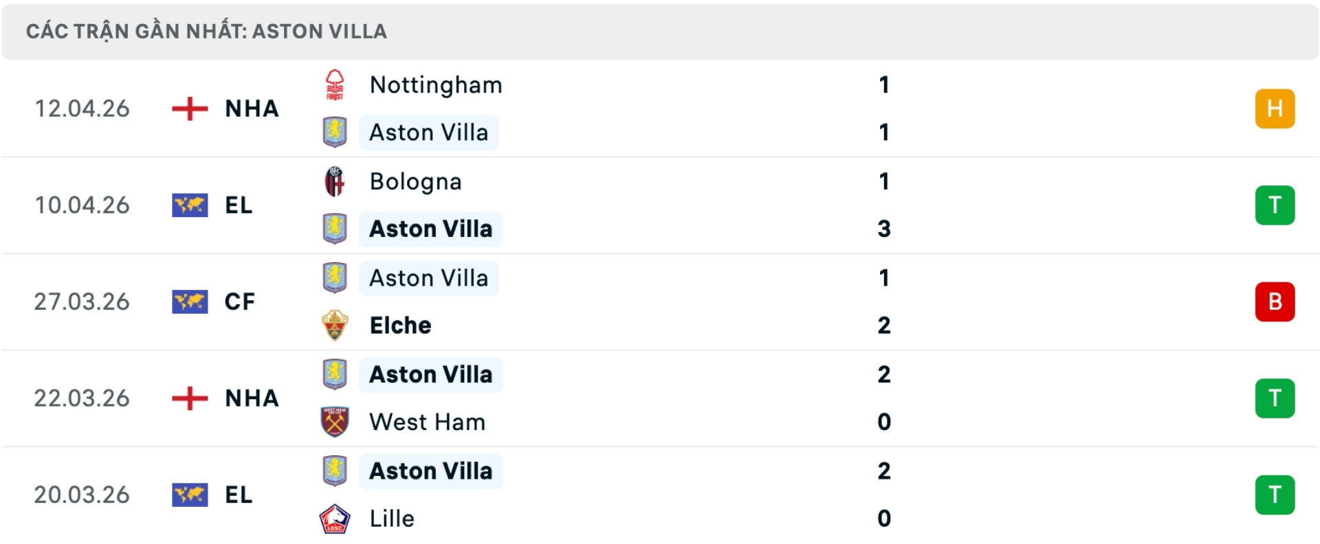 Phong độ Aston Villa gần đây