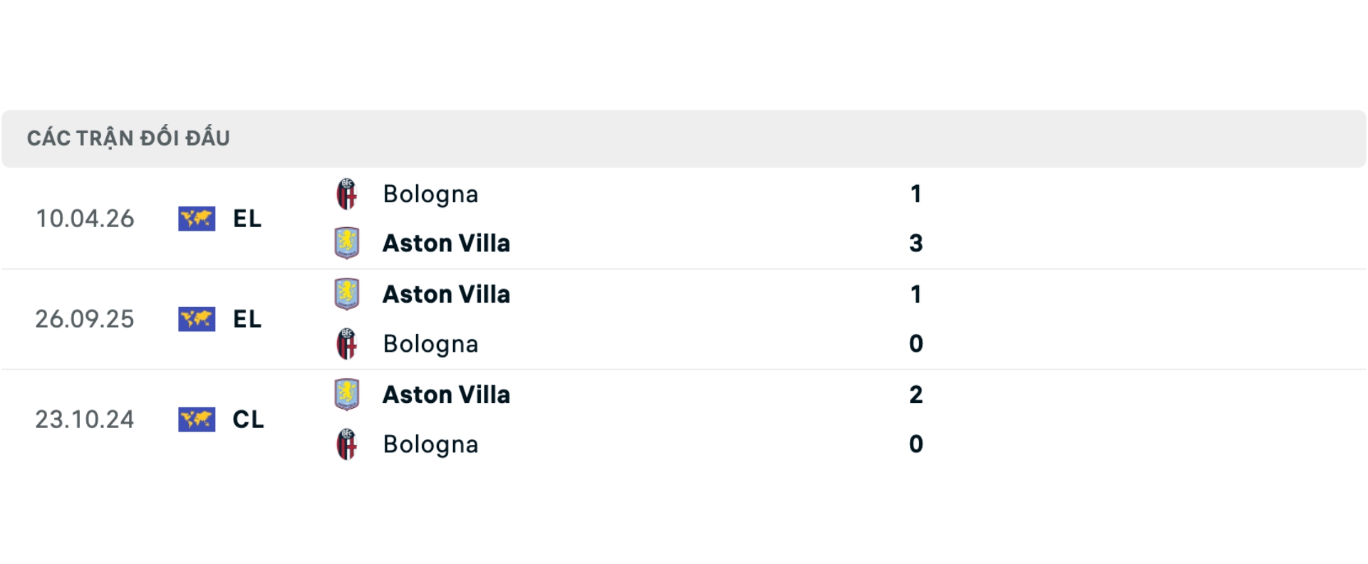 Lịch sử đối đầu Aston Villa vs Bologna