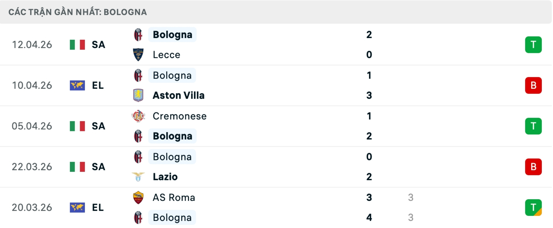 Phong độ Bologna gần đây