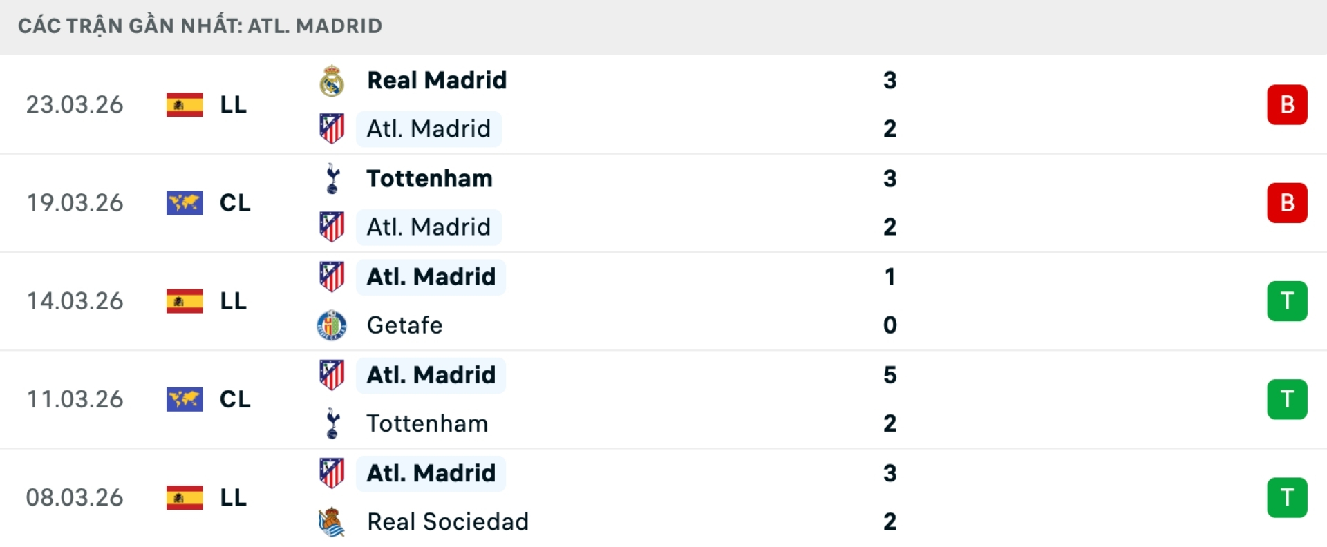 Phong độ Atletico Madrid gần đây