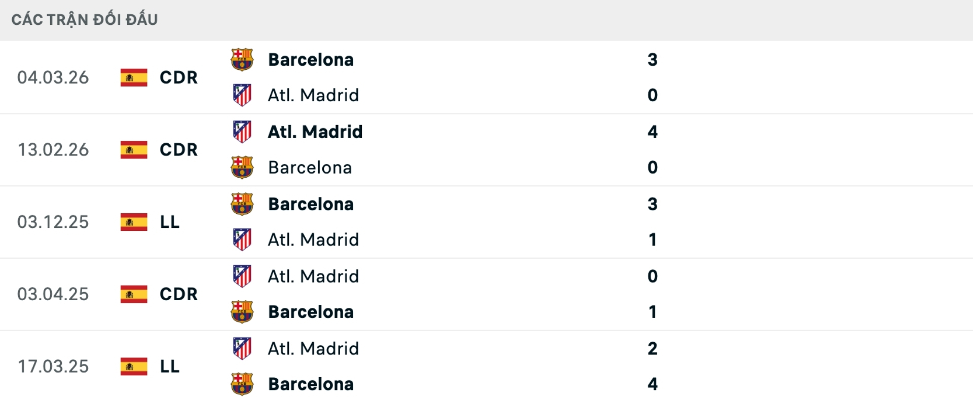 Lịch sử đối đầu Atletico Madrid vs Barcelona
