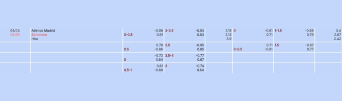 Mốc tài xỉu của trận đấu được niêm yết ở mức 3 1/4, cho thấy giới chuyên môn đánh giá khá cao khả năng xuất hiện nhiều bàn thắng. Hai trận gần nhất của Atletico đều khép lại với tổng cộng 5 bàn, trong khi Barcelona ghi tới 13 bàn chỉ trong 3 trận gần đây. Đặc biệt, 3 lần chạm trán gần nhất giữa hai đội cũng đều có ít nhất 3 bàn thắng được ghi sau 90 phút. Với xu hướng này, cửa Tài là lựa chọn sáng giá.
