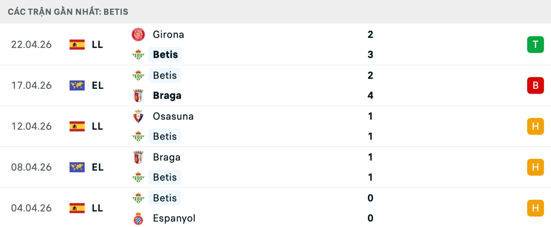 Phong độ Betis gần đây