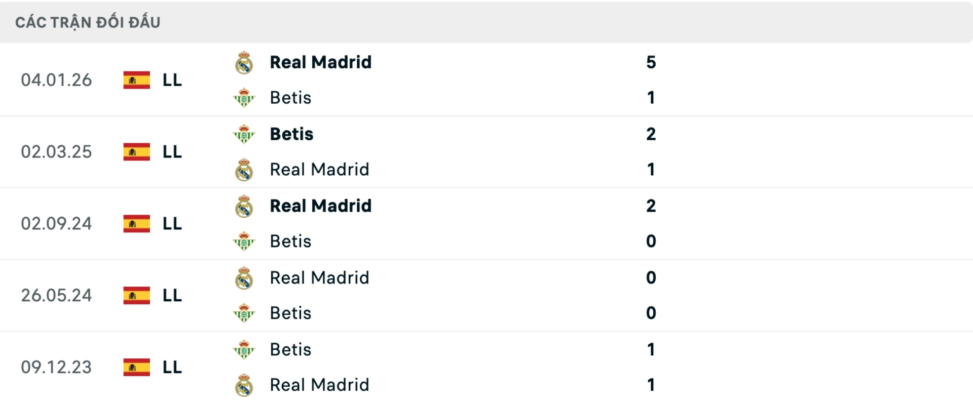 Lịch sử đối đầu Betis vs Real Madrid