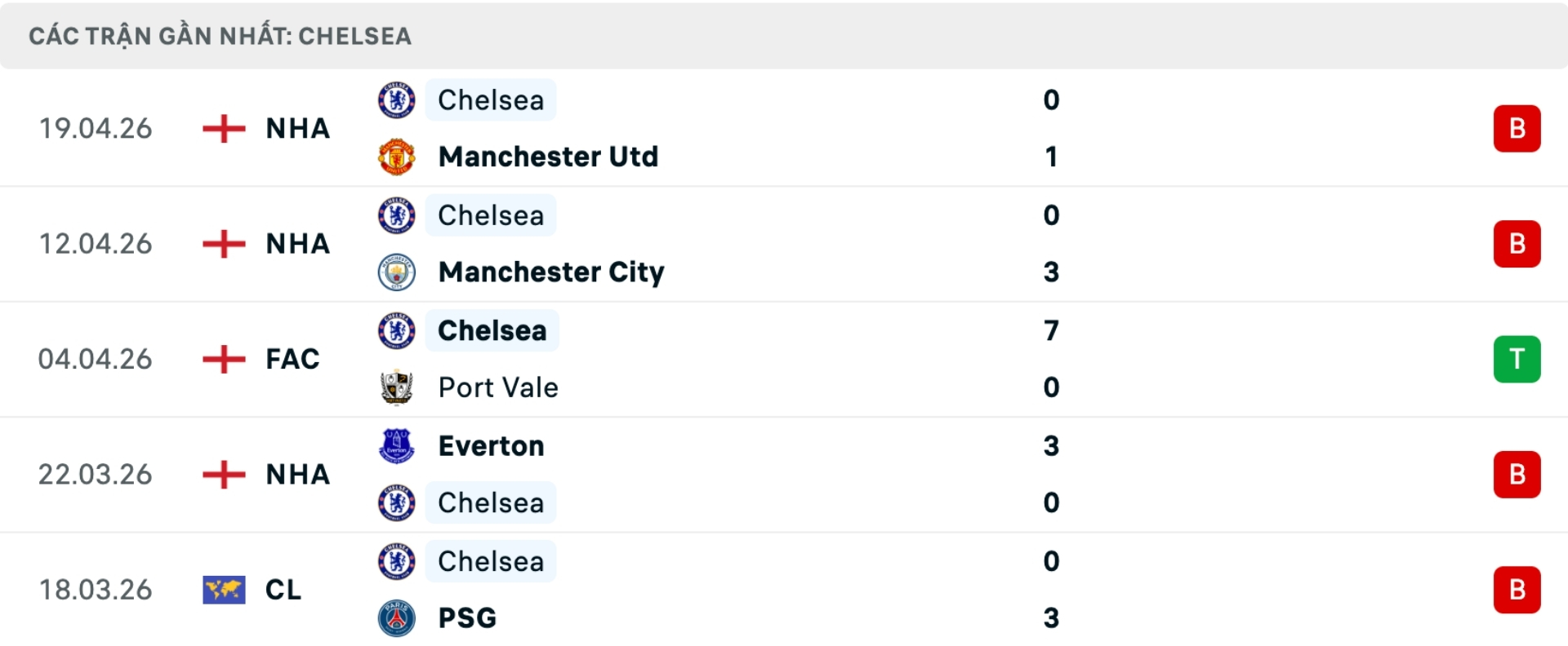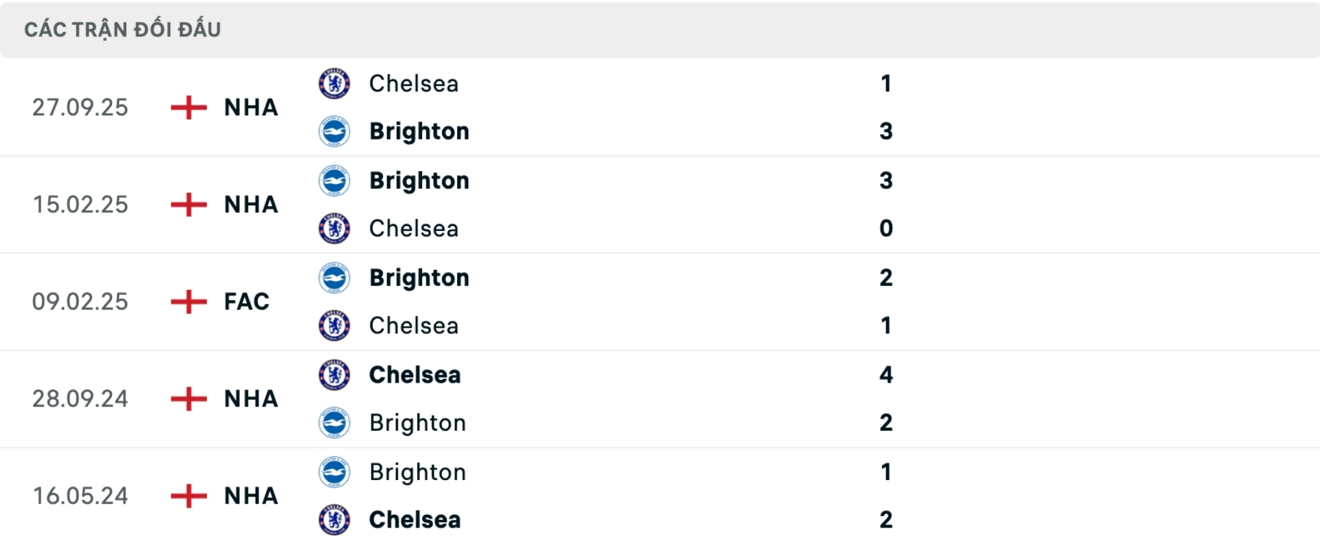 Lịch sử đối đầu gần đây cũng không mang đến nhiều tín hiệu tích cực cho Chelsea. Trong 3 lần chạm trán gần nhất, họ đều thua kèo trước Brighton và nhận tới 8 bàn thua. Nếu không sớm cải thiện chất lượng lối chơi, Chelsea hoàn toàn có thể nối dài chuỗi ngày thất vọng ngay tại sân Amex.