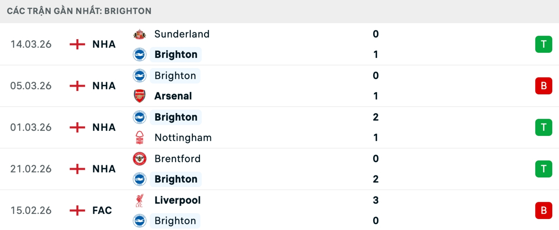 Brighton vừa trải qua giai đoạn khởi sắc sau chuỗi trận thất vọng trước đó. Đội bóng của HLV Fabian Hurzeler đã thắng 3 trong 4 trận gần nhất, chỉ chịu thất bại trước đội đầu bảng Arsenal. Hiện tại, “Chim mòng biển” đang xếp thứ 12 trên bảng xếp hạng với 40 điểm và gần như đã trụ hạng thành công.