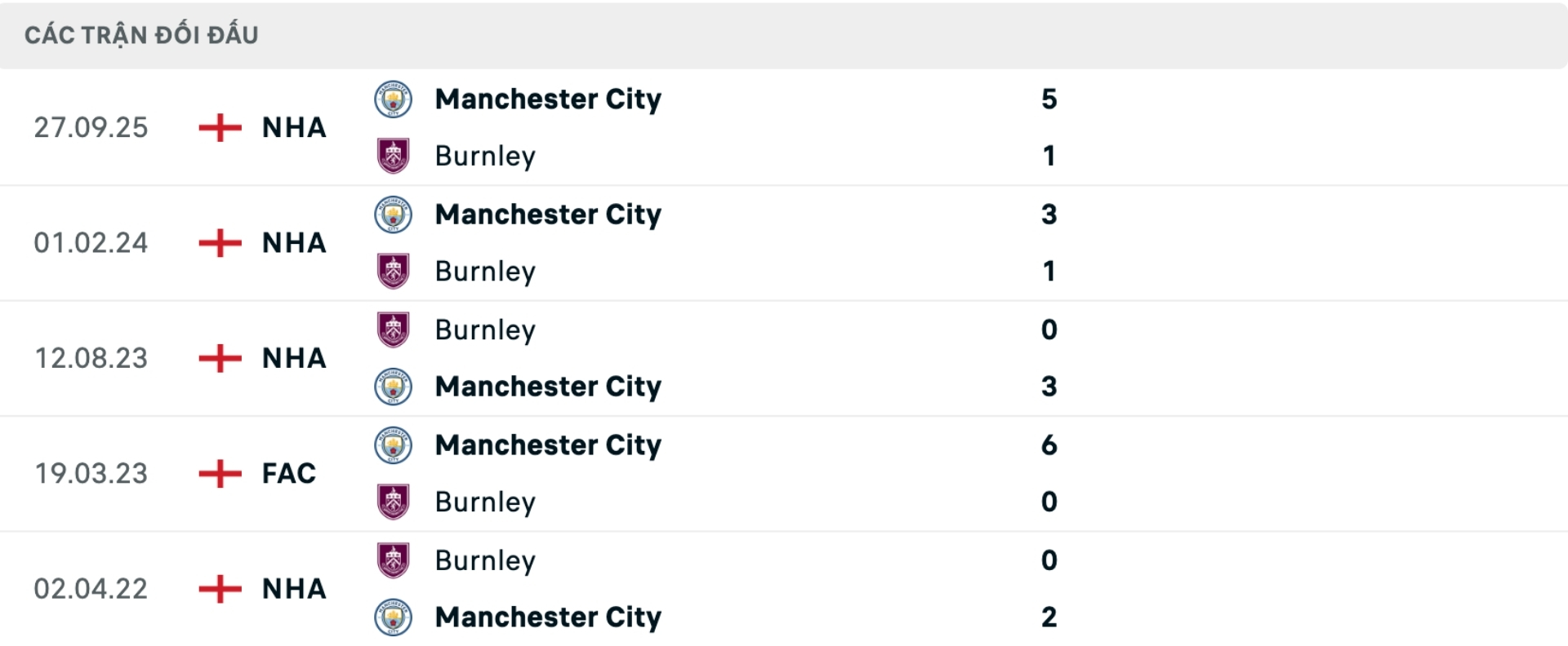 Lịch sử đối đầu cũng đang nghiêng tuyệt đối về phía đội khách. Man City toàn thắng 14 lần chạm trán Burnley gần nhất, trong đó có tới 13 trận thắng với cách biệt từ 2 bàn trở lên. Trên sân của Burnley, The Citizens cũng thắng cả 5 chuyến làm khách gần đây và đều tạo ra cách biệt ít nhất 2 bàn. Với sự chênh lệch lớn về đẳng cấp, phong độ lẫn bản lĩnh, Burnley nhiều khả năng sẽ tiếp tục nhận thêm một thất bại nặng nề.