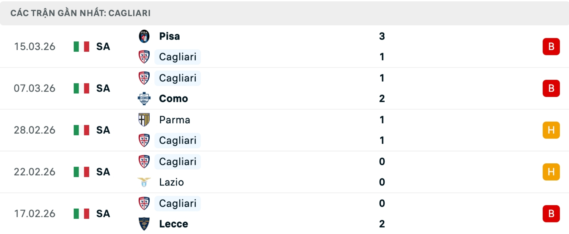 Phong độ Cagliari gần đây