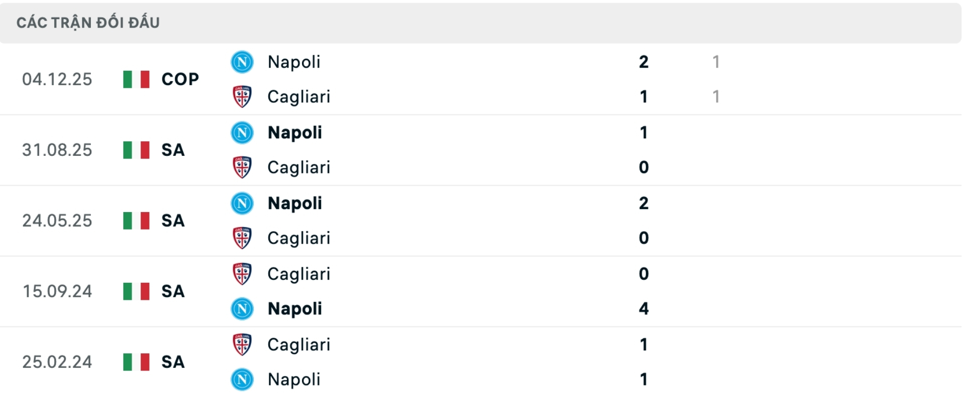 Lịch sử đối đầu Cagliari vs Napoli