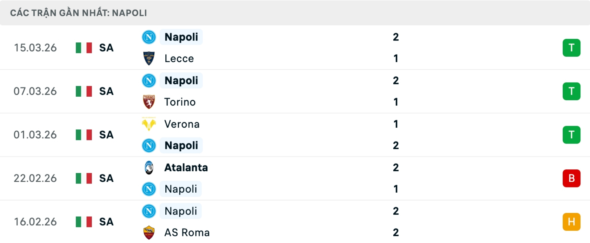 Phong độ Napoli gần đây