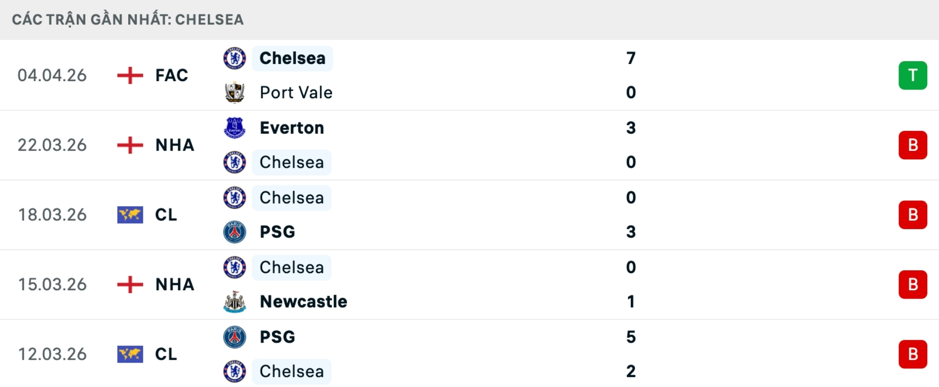 Phong độ Chelsea gần đây