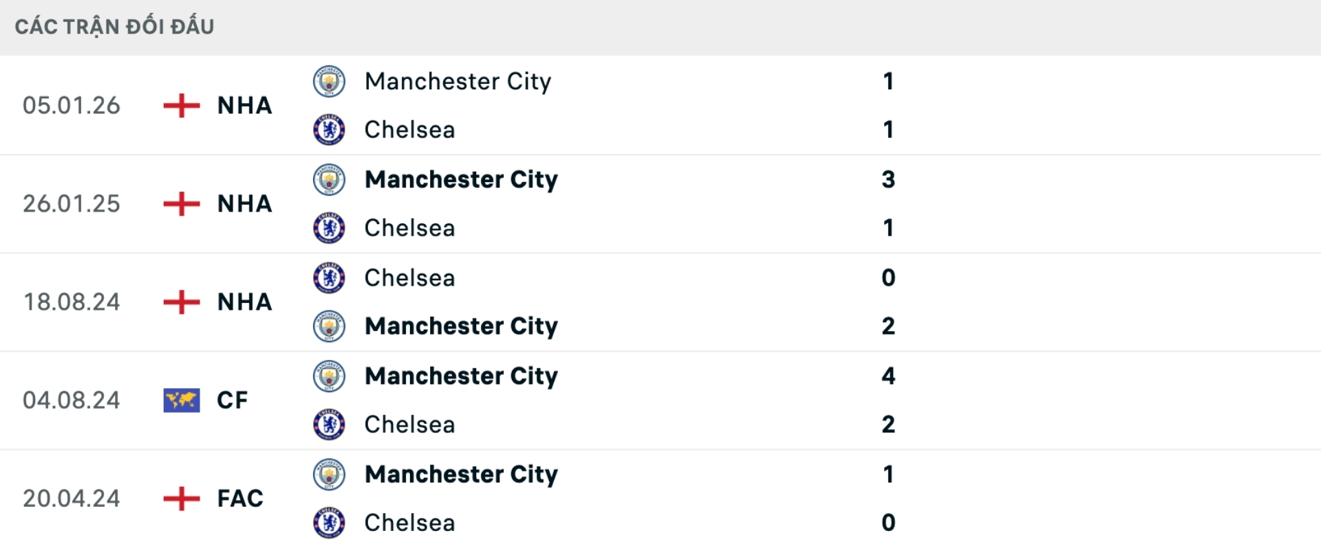 Lịch sử đối đầu Chelsea vs Man City
