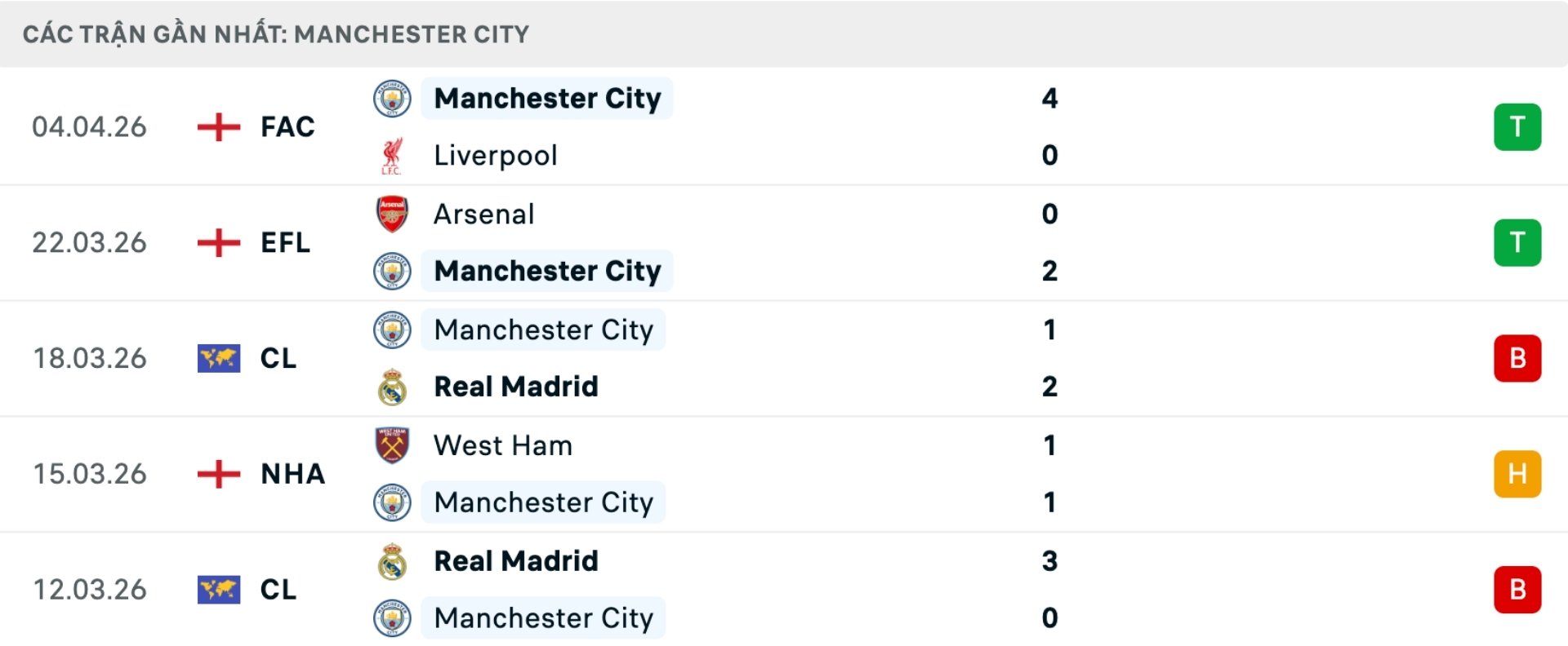 Bên kia chiến tuyến, Man City đang cho thấy hình ảnh trái ngược. Đội bóng của Pep Guardiola bước vào trận đấu với tinh thần rất cao sau chuỗi kết quả ấn tượng. Họ vừa đánh bại Arsenal trong trận chung kết cúp Liên đoàn, đồng thời vùi dập Liverpool 4-0 ở tứ kết FA Cup. Ở Ngoại hạng Anh, việc Arsenal bất ngờ thất bại trước Bournemouth càng mở ra cơ hội lớn để Man City tăng tốc trong giai đoạn quyết định của mùa giải.
