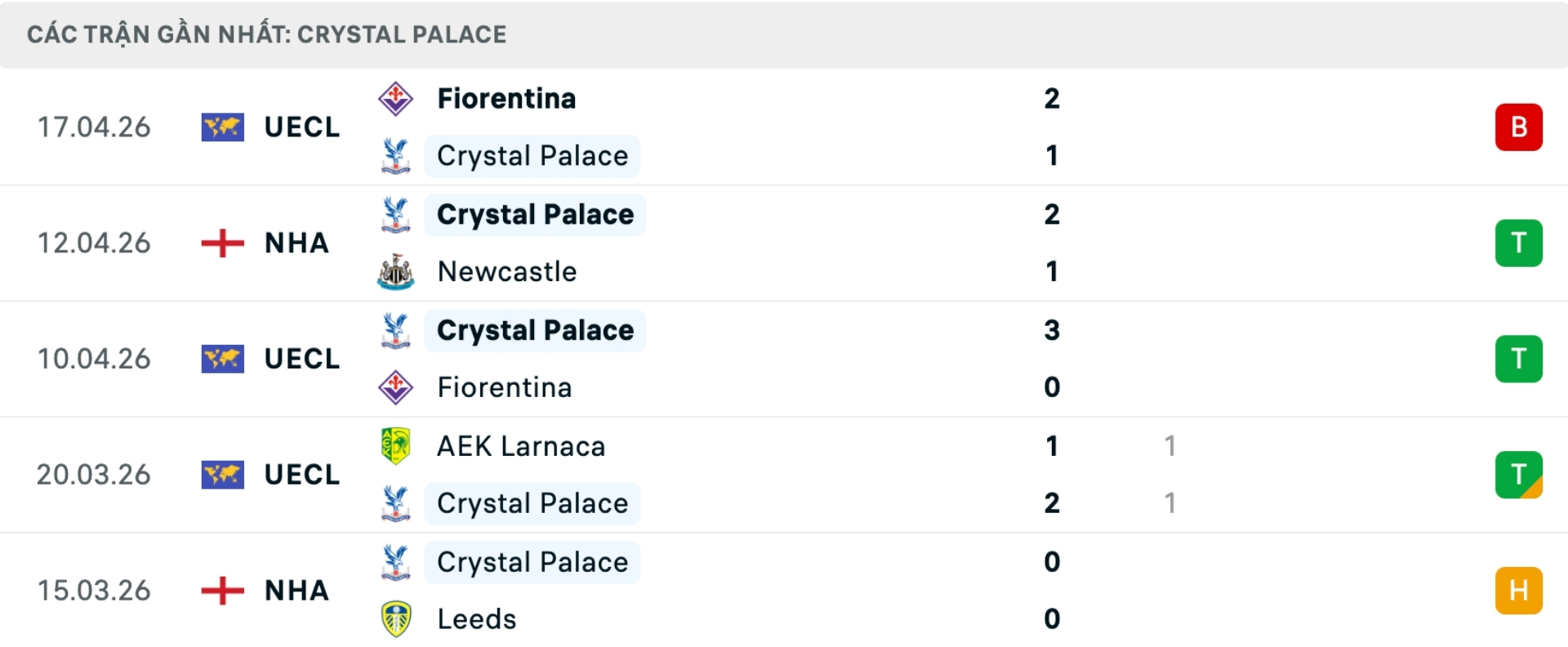 Phong độ Crystal Palace gần đây