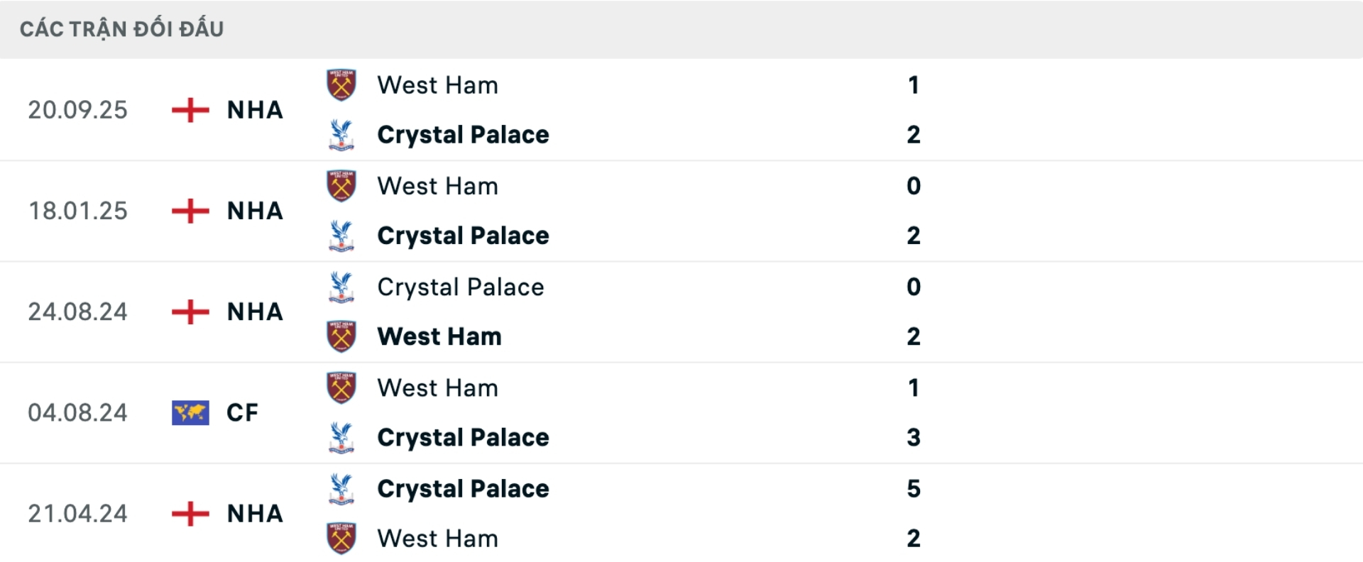 Lịch sử đối đầu Crystal Palace vs West Ham