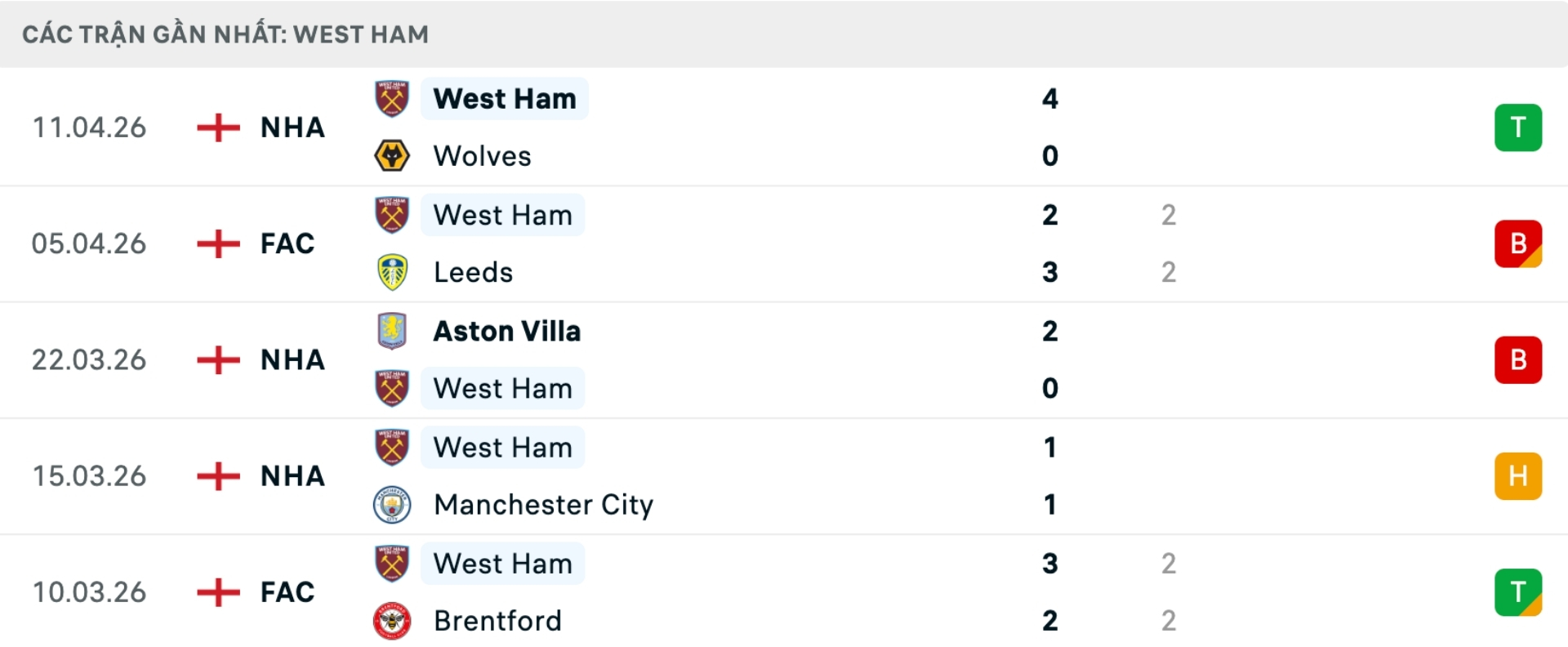 Phong độ West Ham gần đây