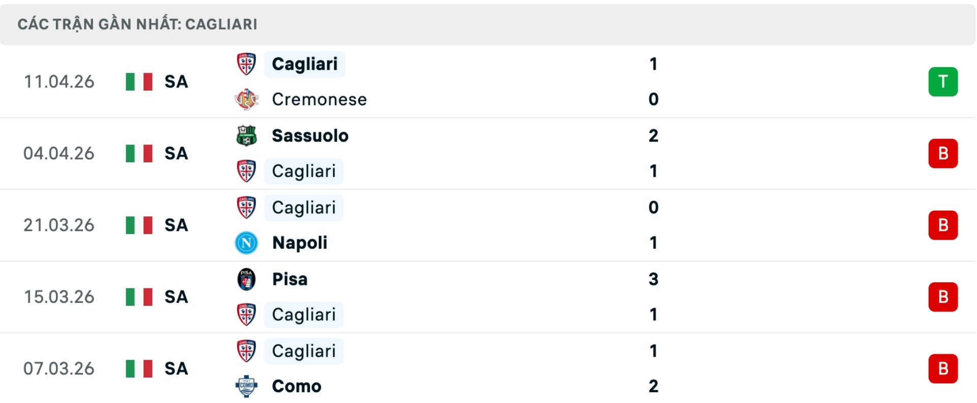 Phong độ Cagliari gần đây