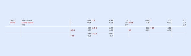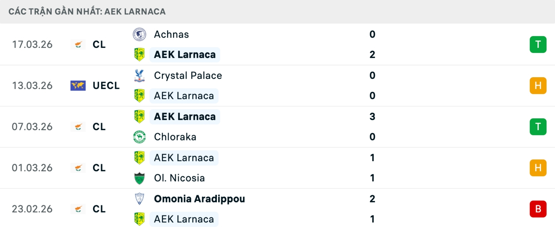 Crystal Palace được đánh giá cao hơn nhưng phong độ tấn công lại không đủ thuyết phục. Trong khi đó, AEK Larnaca đang có chuỗi 3 trận thắng kèo liên tiếp và thể hiện khả năng phòng ngự cực kỳ chắc chắn. Lựa chọn đội chủ nhà được chấp là phương án hợp lý.