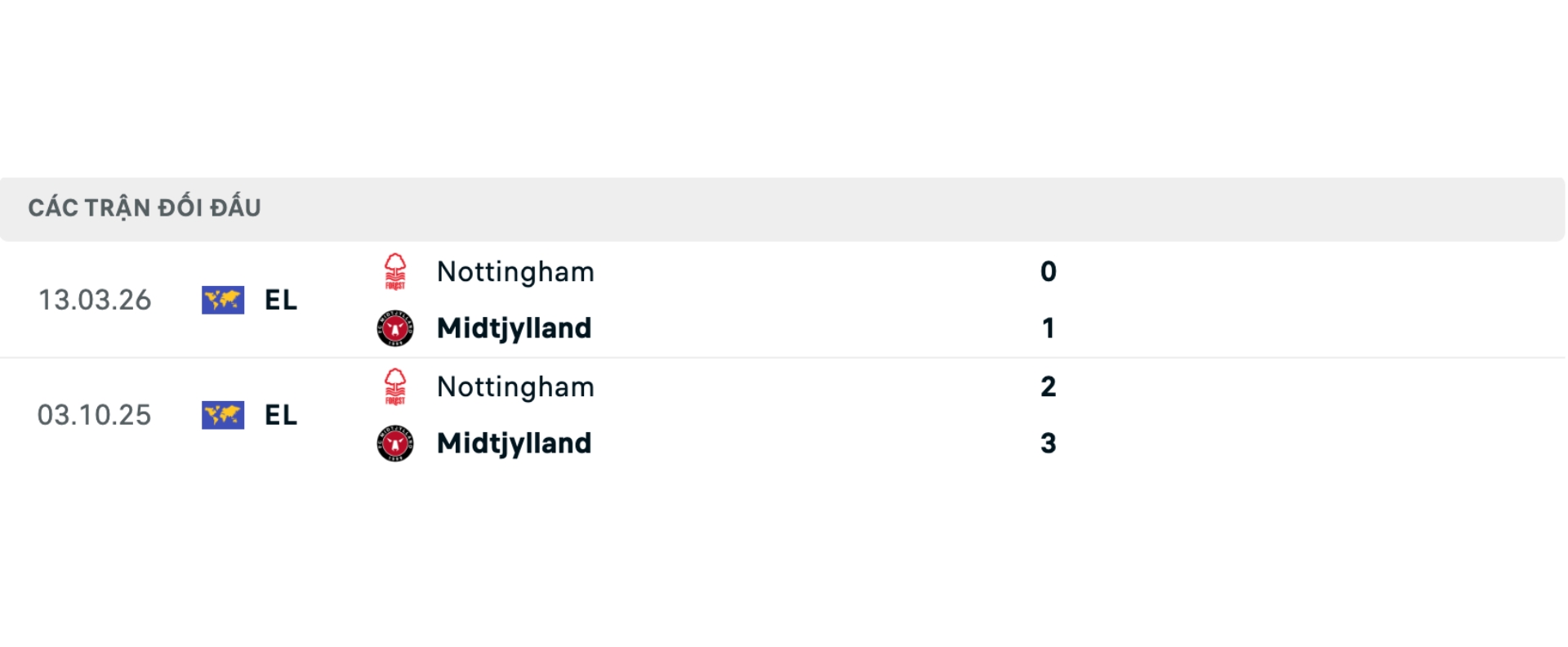 Lịch sử đối đầu Midtjylland vs Nottingham Forest