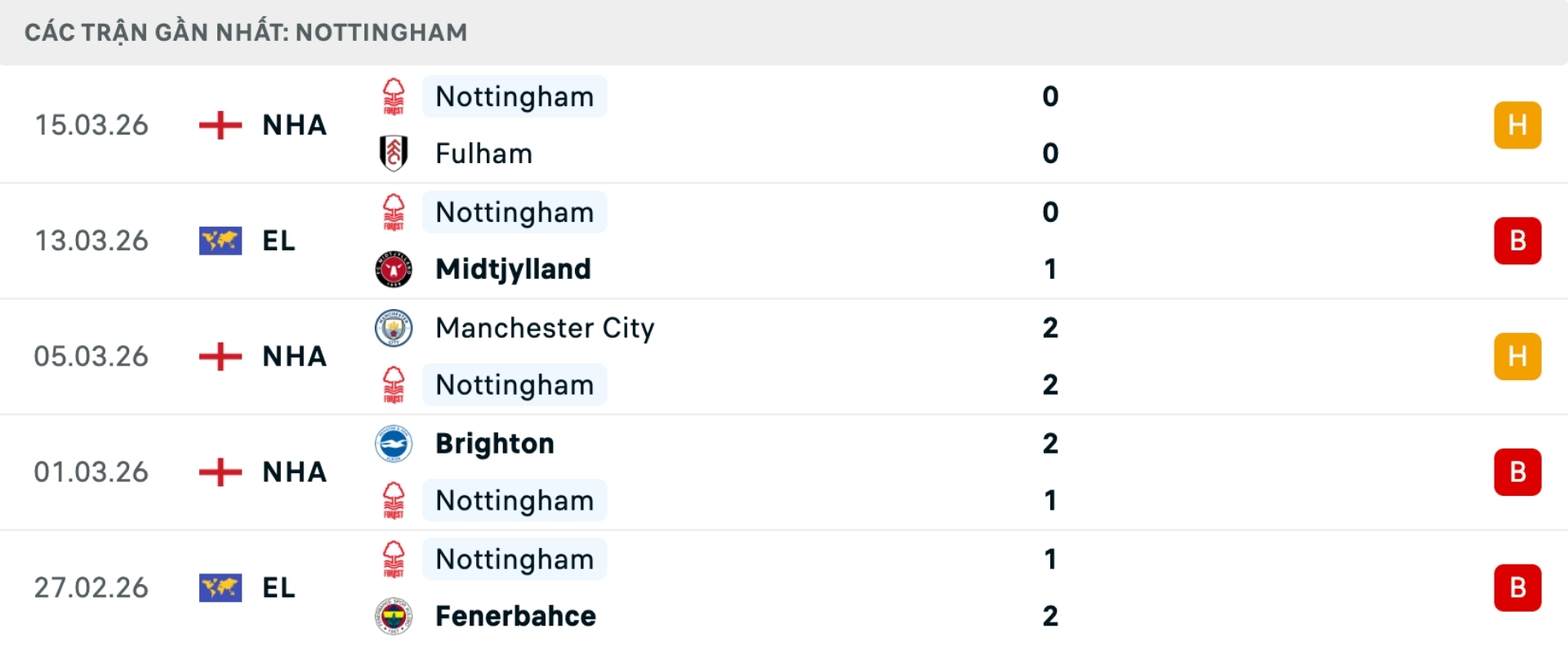 Phong độ Nottingham Forest gần đây
