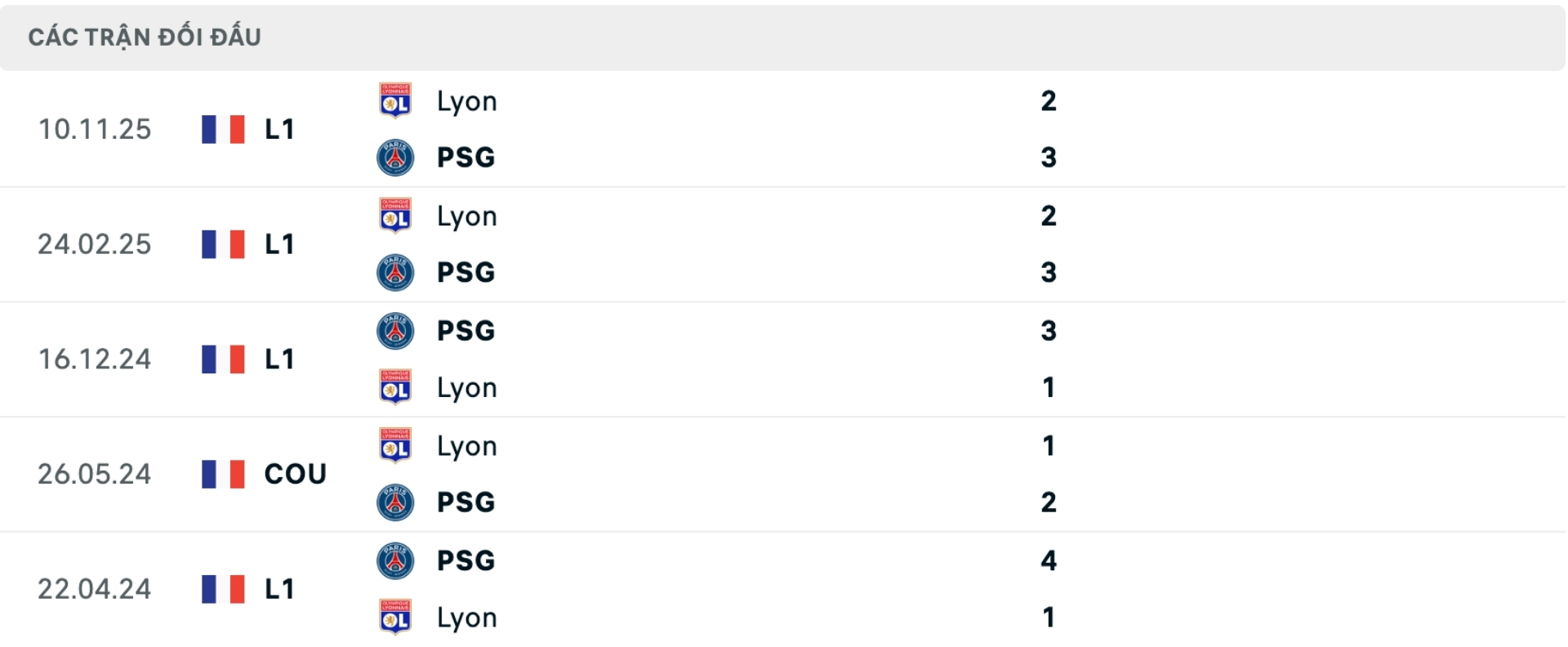 Lịch sử đối đầu PSG vs Lyon