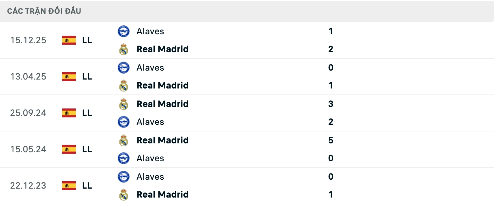 Dù phong độ gần đây thiếu ổn định, Real Madrid vẫn có lý do để tự tin khi chạm trán Alaves. Lịch sử đối đầu đang hoàn toàn nghiêng về phía đội chủ sân Bernabeu. Trong 10 lần gặp nhau gần nhất, Real Madrid giành tới 9 chiến thắng và chỉ thua 1 trận. Trên sân nhà, họ cũng thắng 10 trong 11 lần tiếp đón Alaves gần đây, cho thấy sự áp đảo rất rõ ràng.