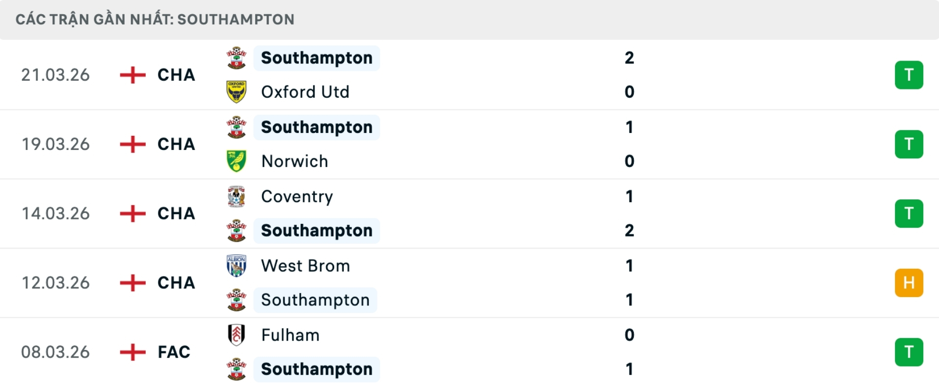 Phong độ Southampton gần đây