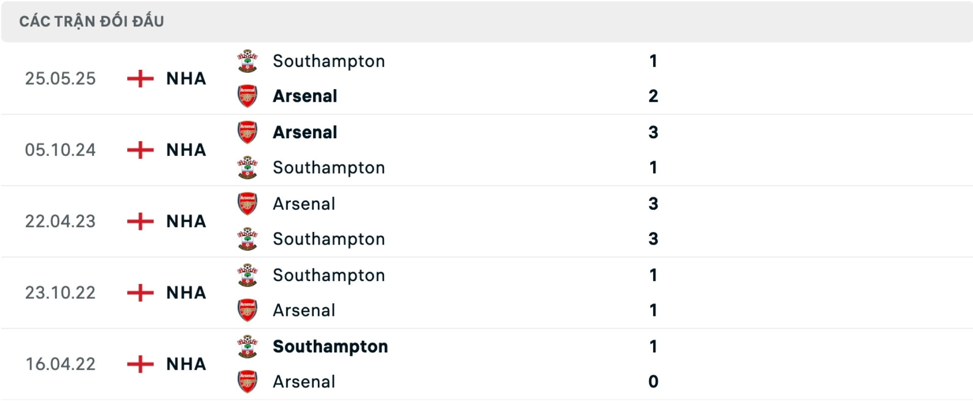 Lịch sử đối đầu Southampton vs Arsenal