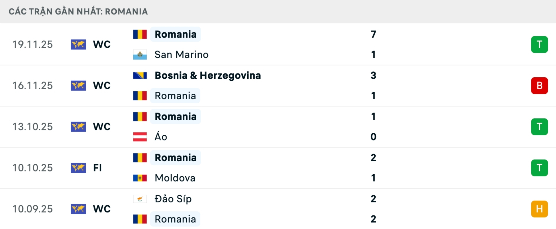 Phong độ Romania gần đây